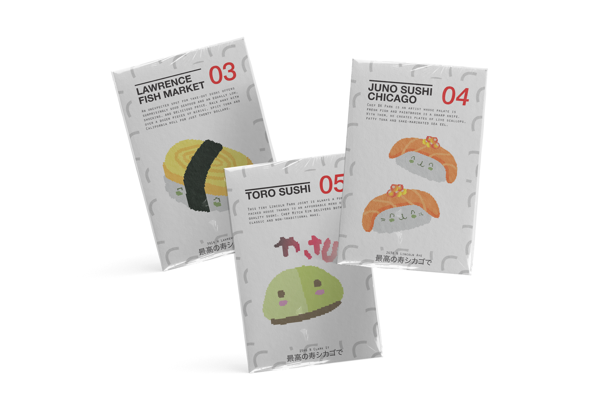 Chicago Sushi Cards was a set of trading-card-esque cards designed to show locals and tourists Chicago's best sushi spots. This deck of cards portrays incredible layout design and illustrations from J Sath.